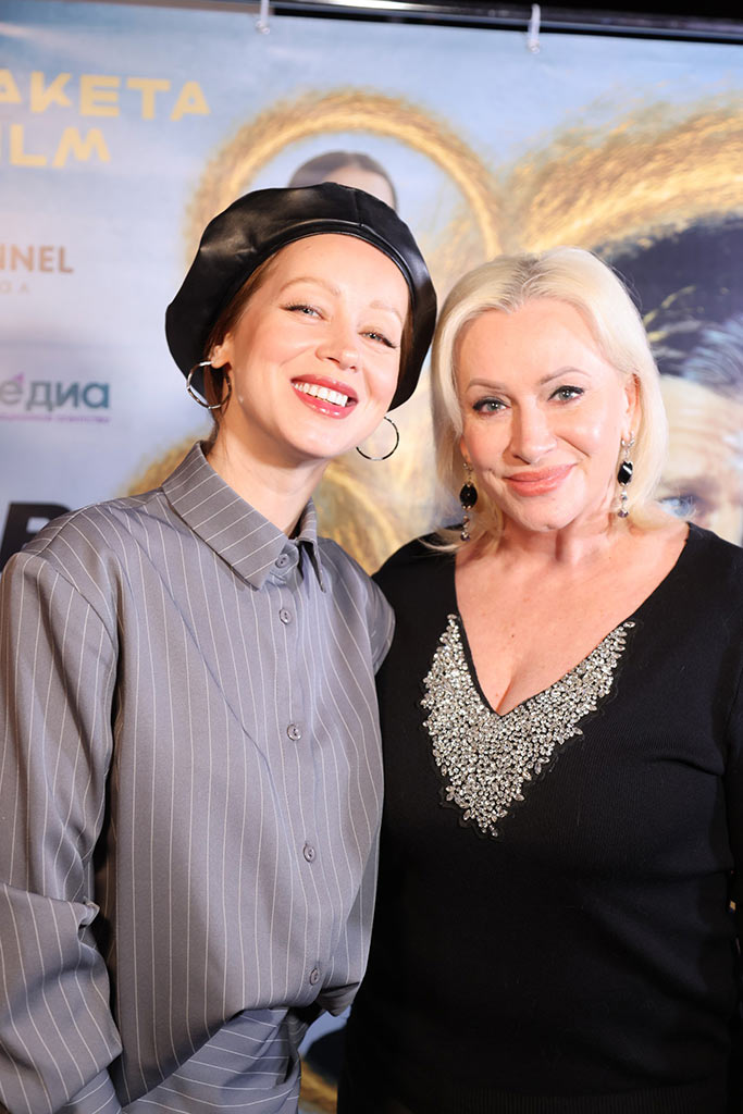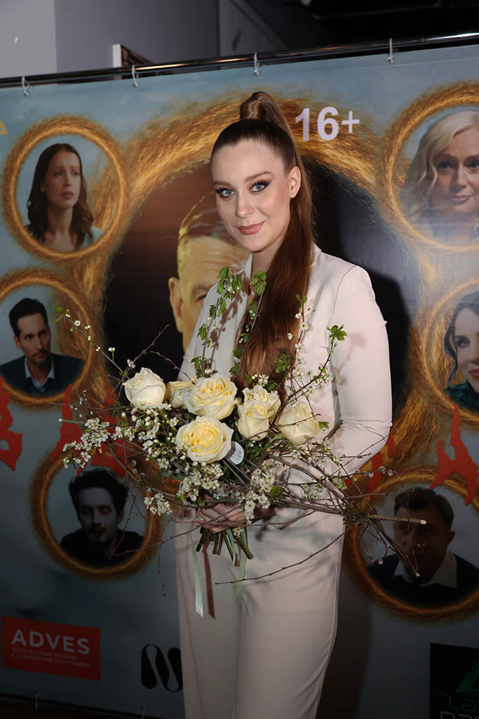 Продюсер и актриса Екатерина Мадалинская представила актеров фильма со сцены. На сцене актрисам были вручены букеты из белых роз и подарки от партнеров фильма.