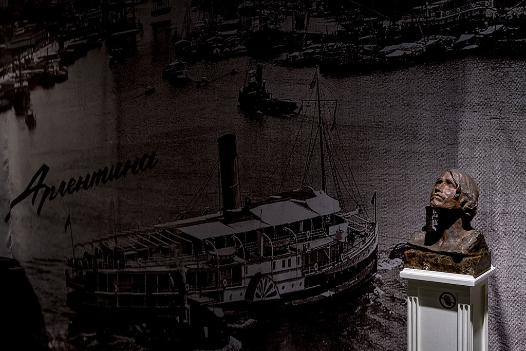 «Эрьзя дружил с уругвайским поэтом Орасио Кирогой. Они вместе были в тусовочных местах, кафе Буэнос Айреса. После смерти товарища Эрьзя сделал его портрет. И эта работа 25 лет, а это по сути надгробие, потому что в затылочной части скульптуры находится урна с прахом Кироги, стоял в гроте. Четверть века сделали свое дело и работа пришла в ужасное состояние. Реставратору нашего Фонда пришлось приложить огромное количество усилий, чтобы как-то сохранить это произведение. После реставрации скульптура осталась в Латинской Америке, а мы сделали слепок, который сейчас можно увидеть только в коллекции Фонда», — рассказала Бутрова.
