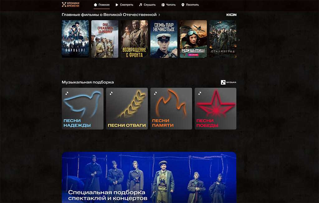 - «Победа» — премьера документальной драмы-реконструкции от KION и «Первого канала»: 6 серий о 6 ключевых сражениях Великой Отечественной глазами тех, без кого победа была невозможна. Впервые в истории отечественного кино стерта грань между военной кинохроникой и современной игровой реконструкцией. На портале «Хроники времени» будет выложена первая серия масштабной драмы;