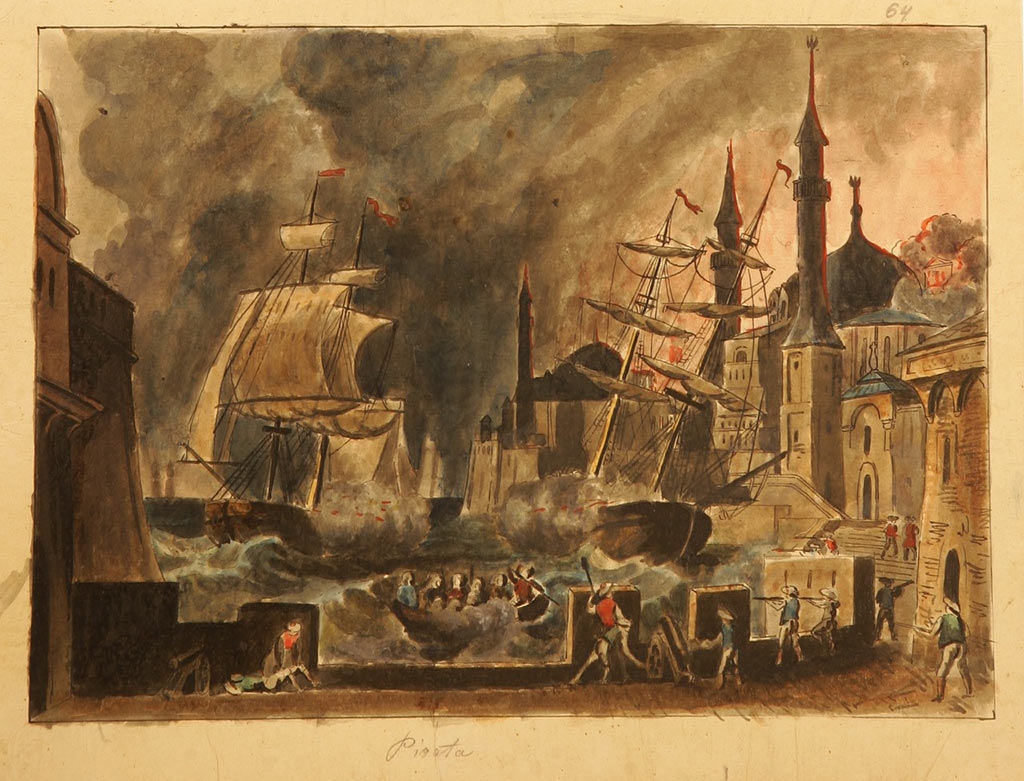 Изображения: А. А. Роллер. Эскиз декорации к опере В. Беллини «Пират». Императорская итальянская опера. Большой (Каменный) театр. 1843 г. Из собрания Санкт-Петербургской государственной Театральной библиотеки.