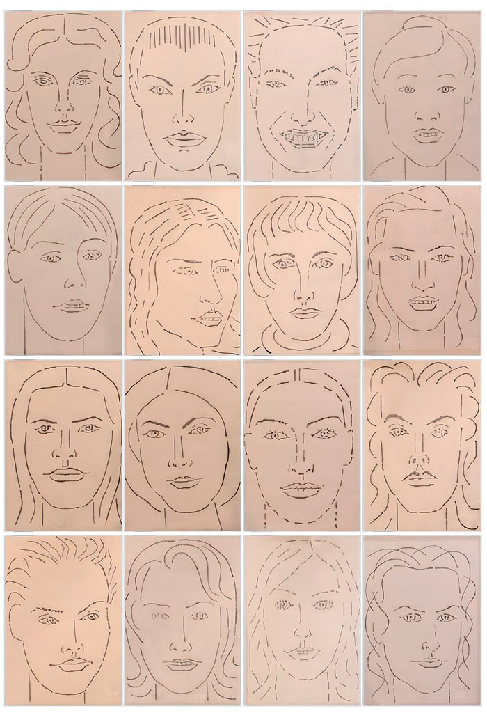 Лев Повзнер (р.1939) в серии «Люди на чёрном», начатой в 1970-х и продолженной в 2020-х, интерпретирует линию психологического портрета в сюрреалистическом ключе. Эти завораживающие бледные, искажённые, фантасмагоричные лица, будто проступающие из темноты, зыбкие и безмолвные, — лишены зрения и обращены внутрь себя.