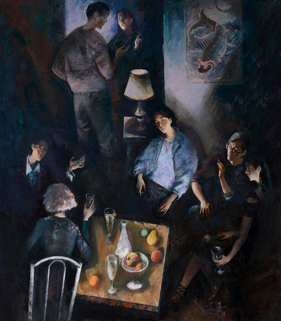 Немало вьетнамских студентов стали выпускниками Санкт-Петербургского академического института живописи, скульптуры и архитектуры имени И.Е. Репина при Академии художеств СССР (сейчас Санкт-Петербургская Академия художеств им. Ильи Репина). Институт всегда славился своим глубинным подходом к историческим, мифологическим и народным темам, монументальный масштаб которых отразился и в работах студентов из Вьетнама. Эпический полиптих Нгуен Данг Миня «Тхать Сань» (2025, рук. А.С. Заставский) повествует о силе духа юноши, преодолевшего множество преград на пути спасения принцессы; триптих Чан Тунг Аня «Наше время» (2025, рук. А.К. Крылов), воспевает образ матроны Ау Ко и бога Лак Лок Куана, даровавших жизнь и процветание вьетнамской нации. Выпускник мастерской профессора В.С. Песикова, а ныне ассистент-стажёр Чан Дык Мин работает на контрасте с героическими темами. В своей дипломной работе «Вечеринка» (2023) показывает главного героя ушедшим глубоко в свой внутренний мир, вопреки оживленной беседе, музыке и всполохам света вокруг. Его одиночество среди толпы людей подчёркивается посредством холодного колорита, ритмики фигур и символа на стене — традиционной вьетнамской гравюры с изображением карпа.