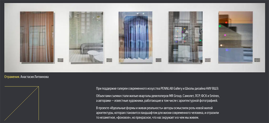 Проект «Идеальные формы и живая реальность» организован сервисом Яндекс Недвижимость совместно с галереей современного искусства PENNLAB Gallery под кураторством художника и фотографа Владислава Ефимова — преподавателя Школы дизайна НИУ ВШЭ, лауреата многих премий и экспонента российских и европейских музеев. Объектами съемки выступили жилые кварталы девелоперов MR Group, Самолет, ЛСР, ФСК и Sminex, а авторами — известные художники, работающие в том числе с архитектурной фотографией.