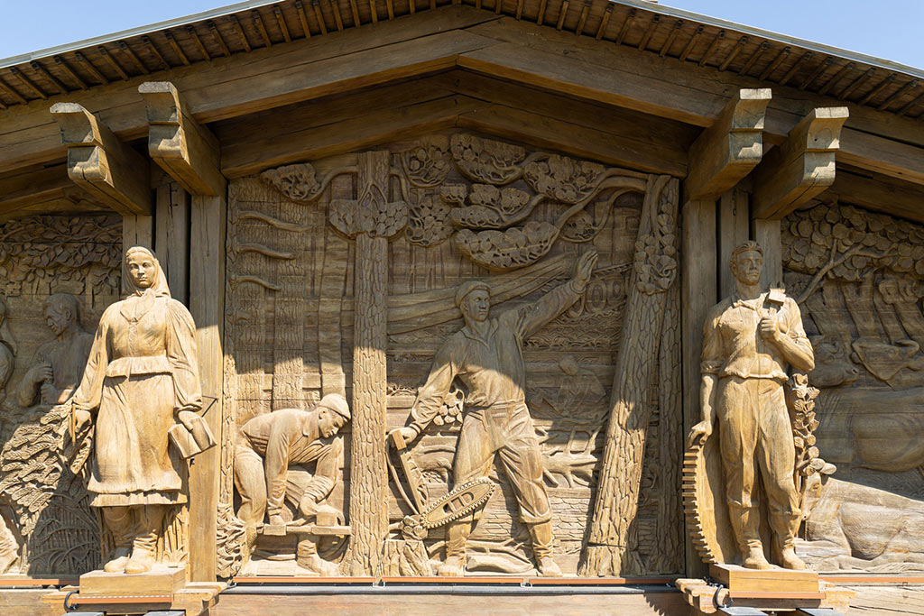 Резной барельеф «Новая жизнь» работы скульптора Льва Кардашова и шесть деревянных скульптур, установленных на колоннах в фронтоне портика главного фасада, считаются главным украшением павильона. Две центральные фигуры — крестьянка и рабочий, справа и слева от них — молодые сосенки с пушистой хвоей.