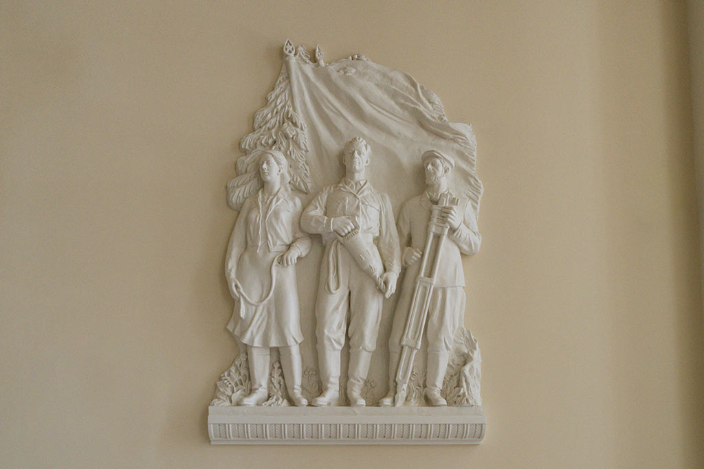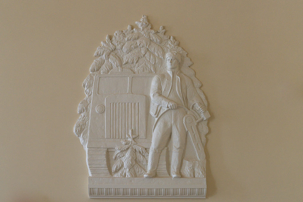 «Были воссозданы элементы декоративного оформления: гипсовые барельефы с изображениями тружеников северного края, бронзовые люстры», — сообщил Мэр Москвы. На них под сенью флагов изображены труженики сурового Севера: рыбаки, лесорубы, хлеборобы. Работы по воссозданию гипсовых барельефов велись по эскизному проекту скульптора при участии авторского надзора. Первоначально в мягком материале были изготовлены рабочие модели, затем, после их утверждения, барельефы были отлиты в гипсе.