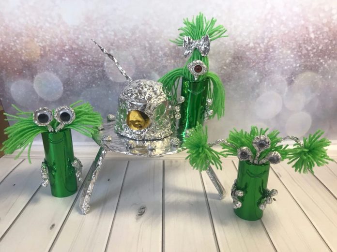 Художник Алена Козырева, 11 лет. Зеленые чудики. 2025. Смешанная техника: картон, цветная фольга, пластик, пряжа. | Россия, г. Новосибирск. МБУДО ЦДО «Алые паруса». Преподаватель Елена Николаевна Жабровец. Номинация: декоративно-прикладное искусство.