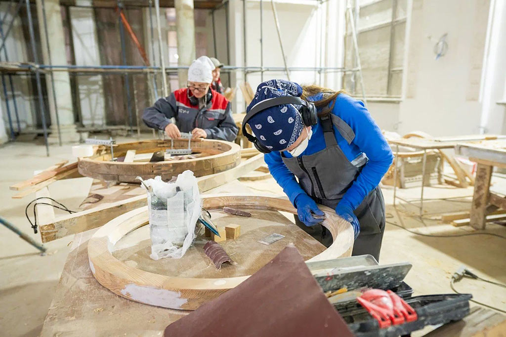 Масштабная реставрация этого объекта культурного наследия федерального значения началась в 2023 году в рамках возрождения главной выставки страны. Сначала специалисты провели противоаварийные работы на террасе третьего этажа, затем укрепили ее по периметру. Внутри здания привели в порядок кирпичную кладку и обработали поверхности гидроизоляционными материалами. Также расчистили лестницы и отреставрировали ограждения лестничных маршей. Кроме того, на входной площадке восстановили прежнее покрытие пола в технике терраццо (заливка пола из каменной крошки таких пород, как мрамор, гранит, кварц, оникс, речная галька и других). Затем в здании установили оконные блоки, а на его фасадах отреставрировали лепной декор. Для этого с декоративных архитектурных элементов сняли многочисленные слои старой краски, устранили повреждения и сколы, а затем воссоздали утраченные участки по сохранившимся образцам. Прежде таких работ в здании не проводилось.